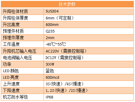 升降柱体采用304不锈钢材质,抗生锈、耐腐蚀